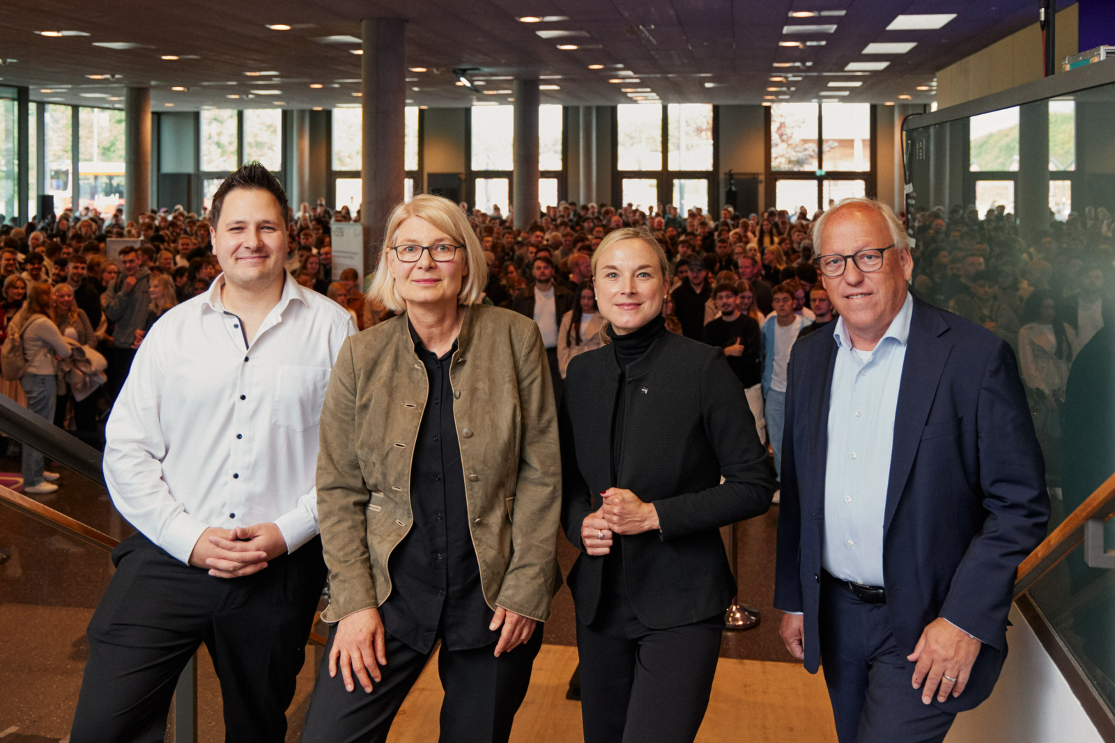 Im Bielefelder Hauptgebäude drängen sich rund 1.000 junge Leute im Foyer, während HSBI-Präsidentin Prof. Dr. Ingeborg Schramm-Wölk und Bielefelds scheidender Oberbürgermeister Pit Clausen ihre Grußworte sprechen. Schramm Wölk: „Nutzen Sie die ersten Begegnungen, um sich mit anderen Studierenden zu vernetzen und sich zu informieren. Auch wenn es erstmal eine Flut an Informationen ist – die HSBI bietet unglaublich viel Beratung und Unterstützung an. Scheuen Sie sich nicht, die Angebote wahrzunehmen und nachzufragen!“