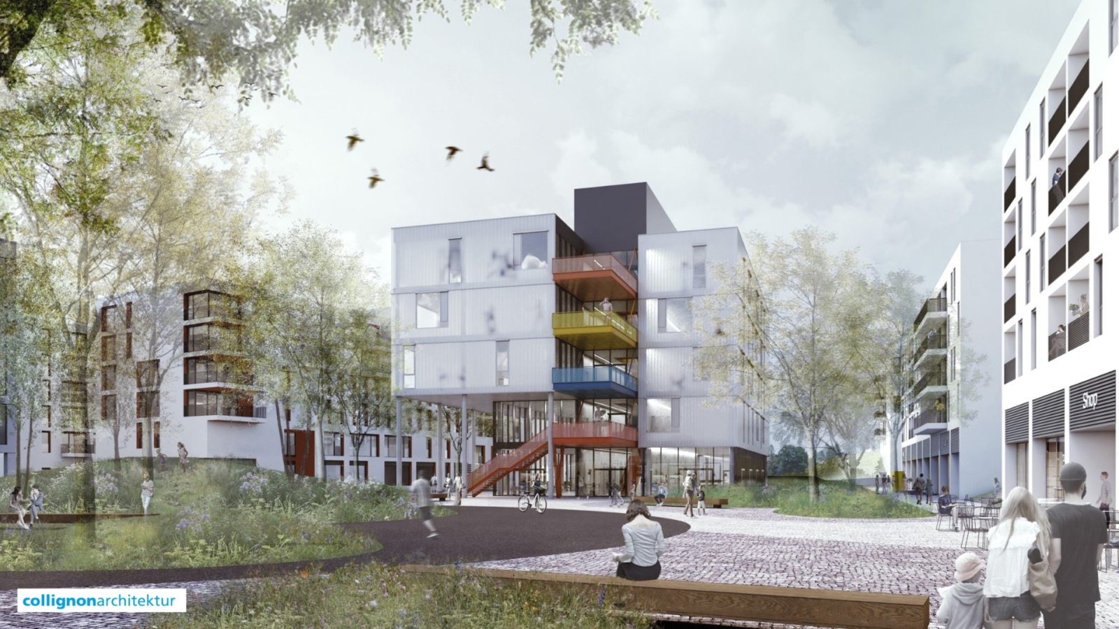 Das Quartiersgebäude bietet den Bewohnerinnen und Bewohnern unter anderem Fitnessräume, einen Shop sowie quartiersnahe Nutzungen. Copyright: Collignon Architektur.