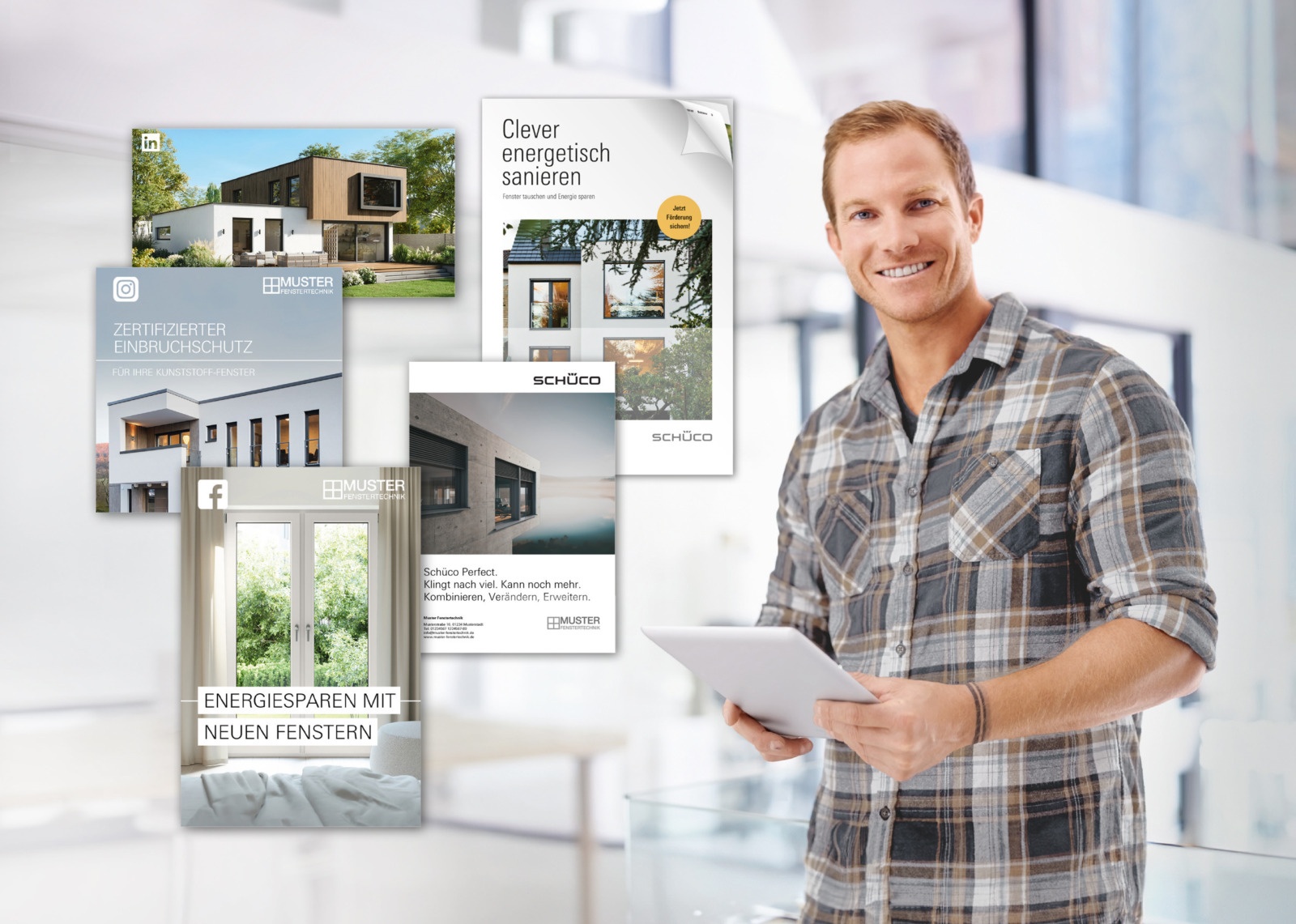 Mit einem eigenen Marketing-Center ermöglicht Schüco seinen Partnern, ihren Werbeauftritt noch weiter zu professionalisieren. Schnell, kostenfrei und rund um die Uhr erreichbar, lassen sich dort individualisierte Werbemedien für verschiedene Kommunikationskanäle erstellen. Das steigert die Sichtbarkeit, erhöht den Verkaufserfolg und spart Agenturkosten.