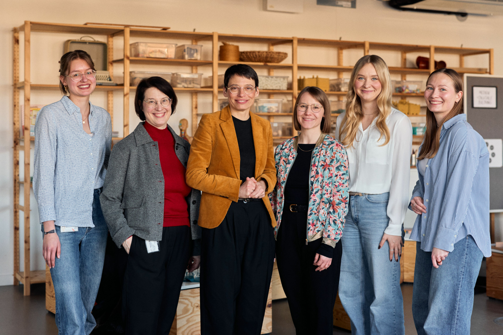 Ministerin Paul (3.v.l.) und das Team der Bildungswerkstatt des Fachbereichs Sozialwesen der HSBI, darunter Prof. Dr. Helen Knauf (2.v.l.) und Milena Förster (4.v.l.), die das Ministerium maßgeblich bei der Aktualisierung der „Bildungsgrundsätze NRW“ unterstützen. (Foto: P. Pollmeier/HSBI)