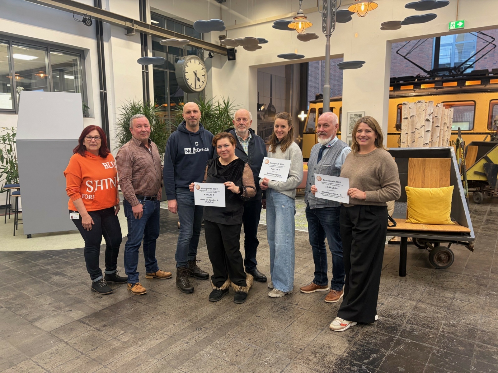 Dank dieser großzügigen Spende von Mitarbeiterinnen und Mitarbeitern der Stadtwerke Bielefeld werden in diesem Jahr drei gemeinnützige Institutionen in der Stadt unterstützt. Die mehr als 32.000 Euro wurden von der Centspenden-Gemeinschaft an das Kinderzentrum e.V., den Verein Hand in Hand und an die Sentana Stiftung für ihr Projekt Gnadenhof ausgezahlt.