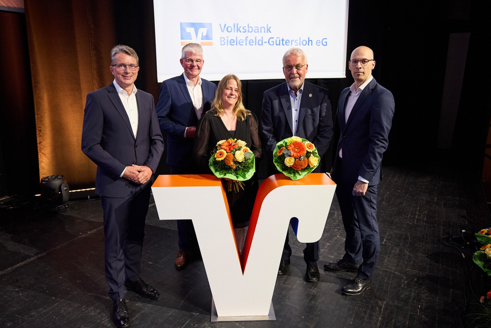 Die Vertreterrinnen und Vertreter zeigten sich sehr zufrieden mit den vorgestellten Ergebnissen und der zukunftsorientierten Strategie ihres Unternehmens. Vorstand und Aufsichtsrat wurden einstimmig entlastet. Außerdem wählte die Versammlung Jürgen Both, Alexander Ihde und Thomas Kamann erneut in den Aufsichtsrat. Aufsichtsratsvorsitzender Michael Mersch gratulierte den wiedergewählten Mitgliedern und schloss in seine Gratulation die beiden gewählten Arbeitnehmervertreterinnen Christina Blankert und Katja Saalfeld ein. Sie wurden zuvor durch die Mitarbeitenden der Volksbank als deren Vertreterinnen in den Aufsichtsrat gewählt. Mit Thorsten Flues, Firmenkundenbetreuer in Verl, verlässt ein Arbeitnehmervertreter der ersten Stunde nach elf Jahren das Gremium auf eigenen Wunsch. Ebenfalls scheidet Henrike Gieselmann nach 13 Jahren auf eigenen Wunsch aus dem Aufsichtsrat aus. Angefangen im Jahr 2011 bei der damaligen Bielefelder Volksbank, war sie auch nach der Verschmelzung 2014 zur Volksbank Bielefeld-Gütersloh Mitglied im Aufsichtsrat der Genossenschaftsbank und hat sich in dieses Gremium mit ihrer Kompetenz für Geschäftsprozesse und Führung und einem hohen Maß an Verantwortungsbewusstsein eingebracht.